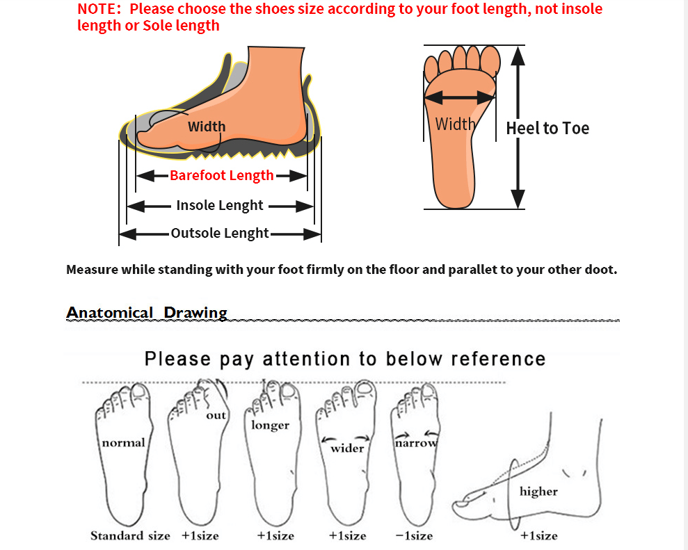 1.The suitable size in the size chart are the maximum size,please allow error about ± 5MM.Compare the size chart with your feet length carefully before ordering.