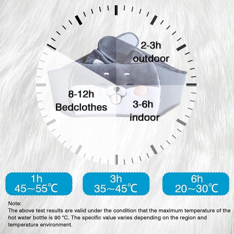 DURABLE AND SAFE - Hot water bottle is made of PVC for maximum safety and heat transfer perfectly, keeping the water warmer for longer. To provide more safety, the temperature of the hot water should not exceed 80 degrees Celsius.