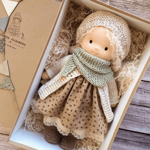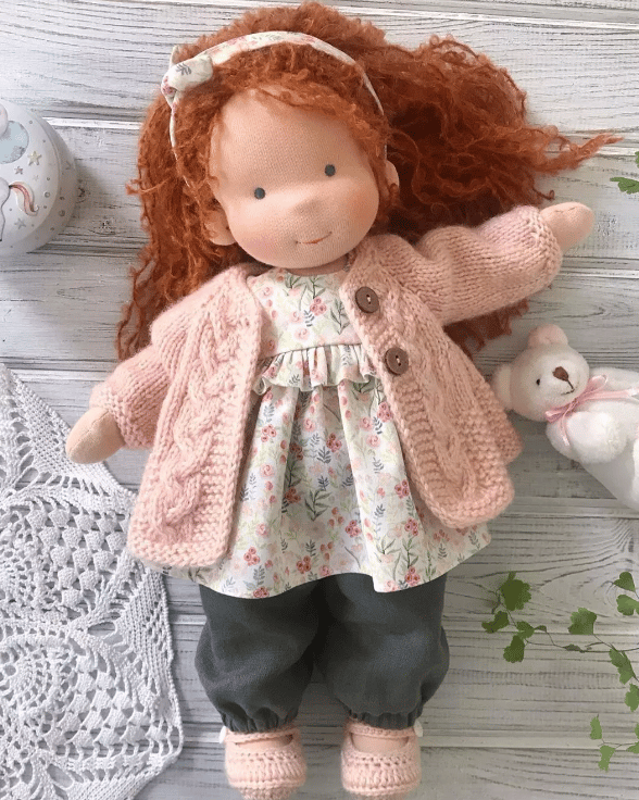 Typically, hair on a doll is made of pure wool such as mohair or boucle, ply wool or cotton. Facial feature details on a doll vary with the maker and are generally simple stitches, sometimes painted, but are always a simple suggestion and ideally neutral, so the child can imagine the personality and mood of the doll and whether the doll is awake or asleep. Some dolls have small suggestions of noses. Skin, eye and mouth colors vary with each doll, ideally to reflect the colouring of the child for a first doll.