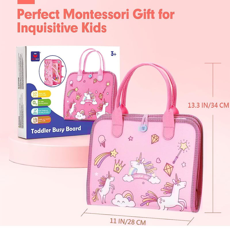 The life skill and cognitive board is linked by zipper, which is removable to allow toddlers focus on and encourage both solo and collaborative play. It makes a great quiet time toy, which can provide relief for parents.
