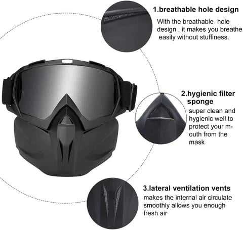 - Breathable Design- The front mouth filter covered by a sponge to help us filter the dust in the air, ensure air circulation, avoid exhaled air to fog the goggles lens.