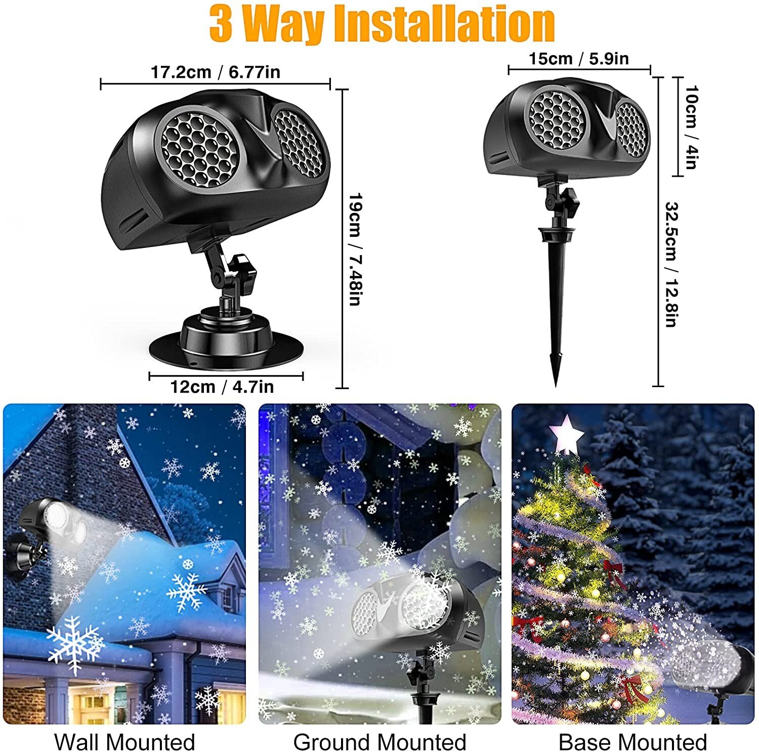 SNOWFLAKE PROJECTOR WITH MORE CLEAR AND LARGE AREA: 50% clearer and larger area than other snowfall lights, fully upgrade the internal structure, after innumerable times experiments with wide-angle lens refraction, so that led lights can be fully projected to get the clearest snowflakes and the projection area up to to 600 ft², and the use of ultra-silent motor-driven binocular rotation, so that the snowflake movement true and natural snowfall.
