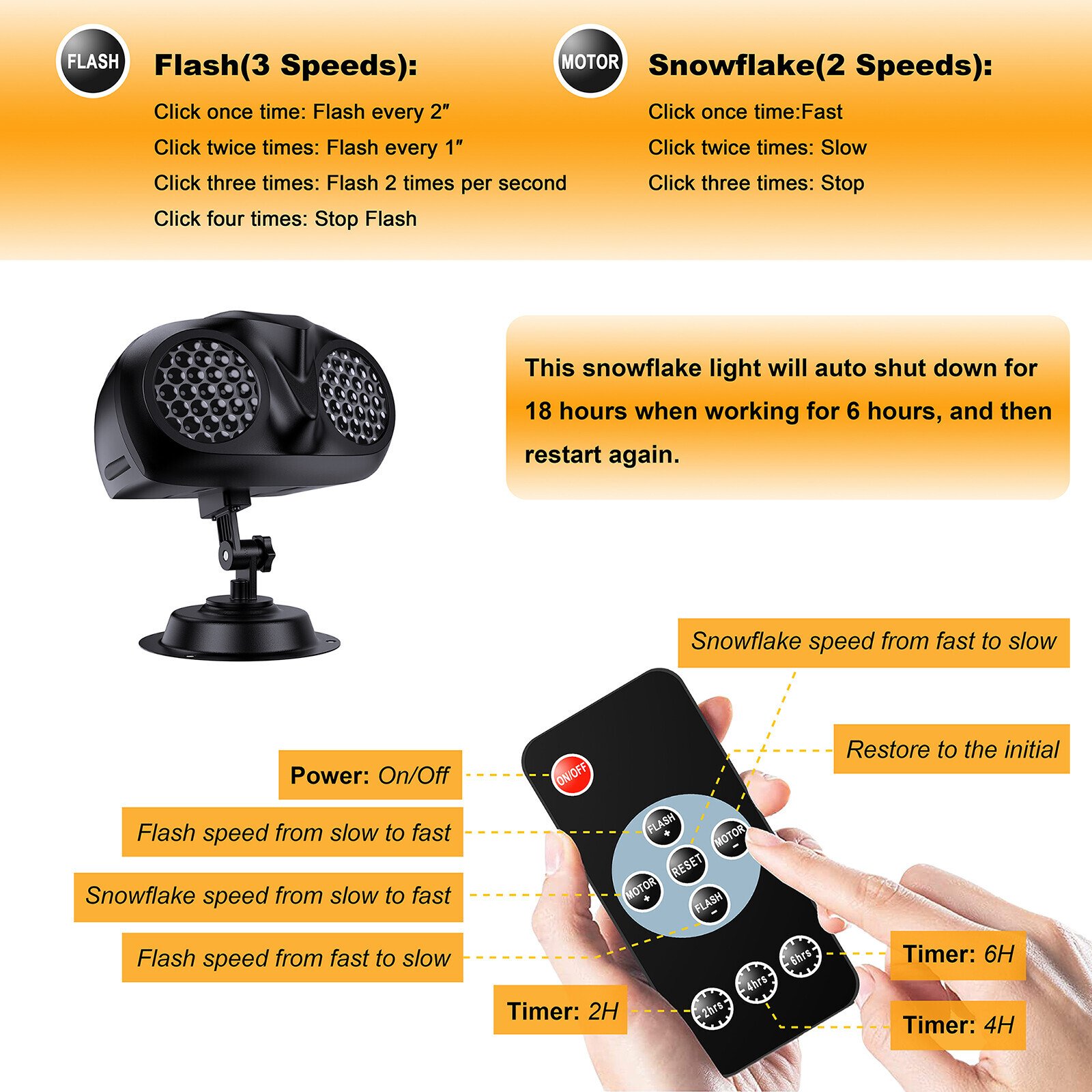 In addition, the snowflake light will auto shut down for 18 hours when working for 6 hours, and then restart again.